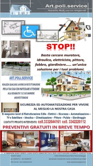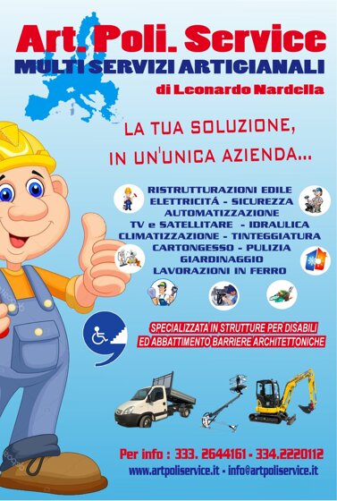 Art.Poli.Service è una giovane realtà in espansione che opera in tutti i campi dell’edilizia sia civile che industriale e specializzata principalmente in ristrutturazioni con abbattimento barriere architettoniche, rifacimenti di coperture, riqualificazioni energetiche di edifici di qualsiasi natura, impiantistica elettrica, lavori in ferro e serramenti, giardinaggio e pulizia generale (condomini, palestre, capannoni, uffici e locali pubblici & commerciali).